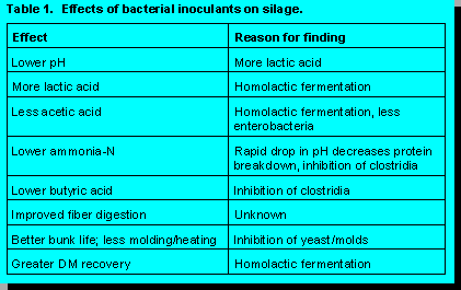 Bacterial inoculants have improved fermentation and animal performance in cereal silage (5), grass silages (3) and alfalfa silage (4). When compared to untreated silages, inoculated silages usually (but not always) are lower in pH (due to higher lactic acid), acetic acid, butyric acid and ammonia-N (Table 1). However, changes in fermentation end-products, digestibility, or intake are meaningless unless accompanied by one or more of the following: